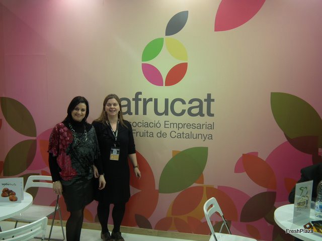 Elisenda Casals y Montserrat Corderoure en el stand de Afrucat, asociación representante de los productores y exportadores de fruta de Cataluña.