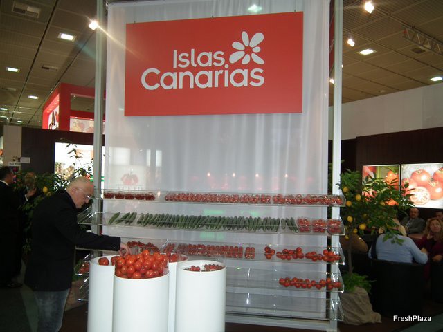 Stand de Las Islas Canarias ofreciendo sus tomates y pepinos, una tentación irresistible para muchos de los visitantes como el que aparece en la foto.