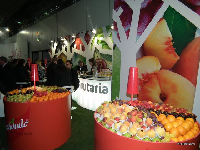 Gran stand de la empresa Frutaria, de Zaragoza, promocionando su fruta de hueso, fruta de árbol y cítricos.