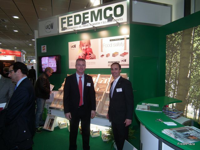 Roberto García Esteve y su compañero en el stand de Fedemco, promocionando los envases para frutas y hortalizas de madera. Este año están tomando importancia los envases pequeños.