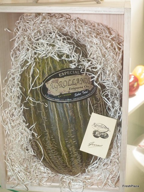 Melón Piel de Sapo envasado en su caja especial con viruta, en el stand de SAT Agrollanos