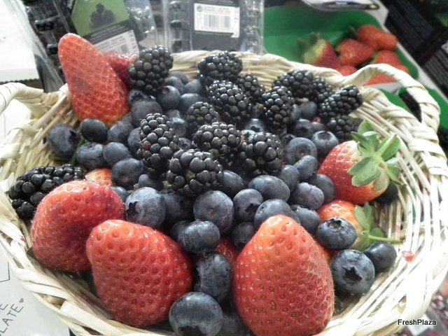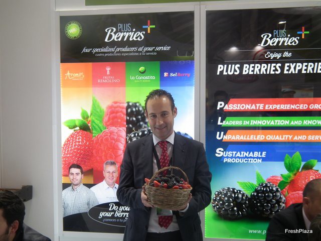 Daniel Velo, mostrando la cesta de berries de Huelva en el stand de Plus Berries.