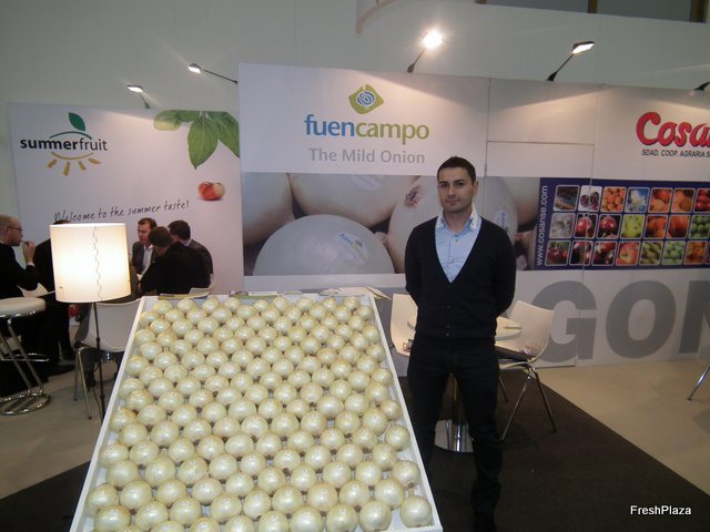 Alberto Pérez, de Fuencampo, en Zaragoza, promocionando las cebollas blancas.