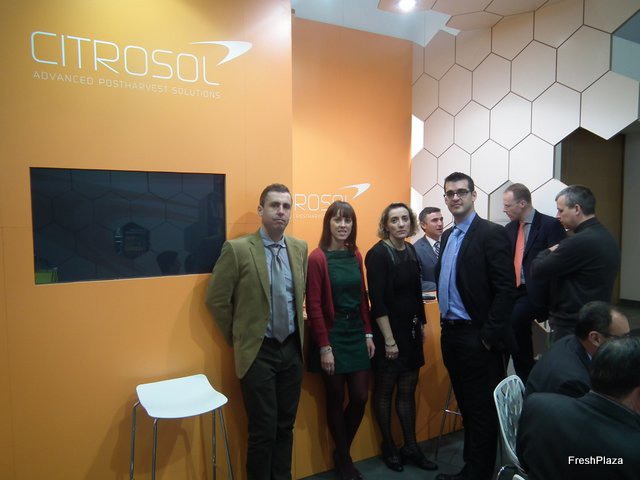 Stand de CITROSOL, de Valencia, con Jorge Bretó, Director Técnico; Carmen Jiménez, Directora de Calidad; Encarna Martí, Responsable de Marketing y Carlos Marín, del Departamento Internacional, presentando sus últimas novedades en soluciones Post Cosecha.