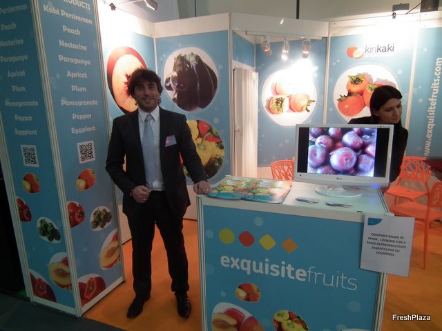 Kiko Torres, gerente de Exquisite Fruits en su stand, promocionando las frutas y verduras de Valencia.