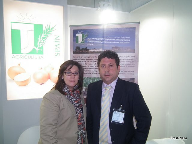Patricia Martínez y Miguel Escribano en stand de TJ Argicultura, promocionando las cebollas amarillas de Cuenca.