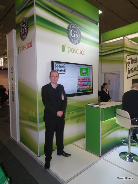 Adam Hill, en su stand de Pascual Marketing S.L, ubicada en el pabellón 8.2. La empresa ofrece toda clase de lechugas y ensaladas envasadas con marcas como Pascual Prestige y Love Fresh.