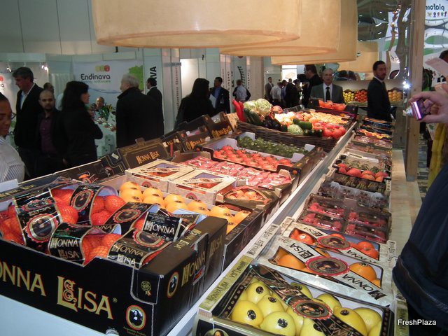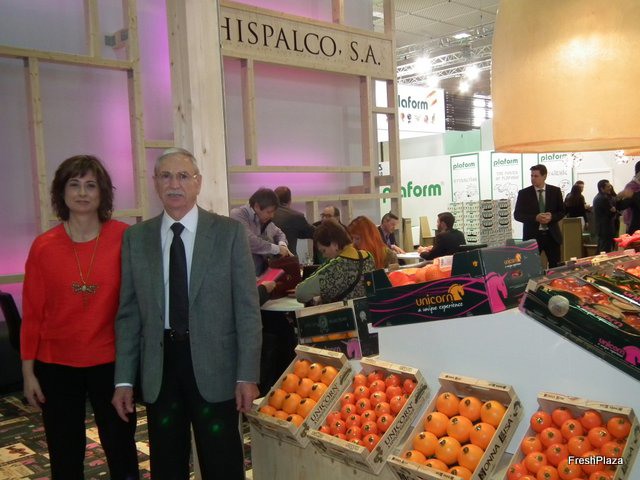 Gama de frutas y hortalizas expuestas en el stand de Hispalco con las marcas Monalisa, Monina, Unicorn, Hispalco Bio etc.