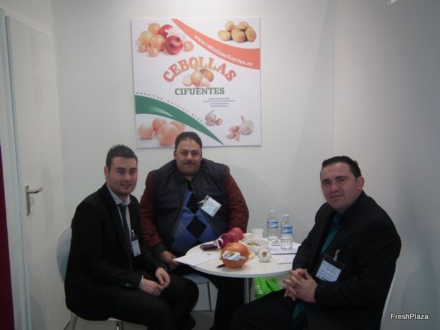 Eduardo Pérez y José Antonio Cifuentes en su stand de Cebollas Cifuentes recibiendo la visita del importador argelino Thrwat Fatas.