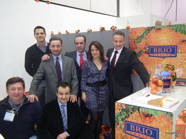 Los hermanos Alarcón junto con Luis González,Cándido Amador y Pascual Prats, en el stand de Agrios Selectos y Banagrumes Sas promocionando la marca para cítricos Brio Fruits.