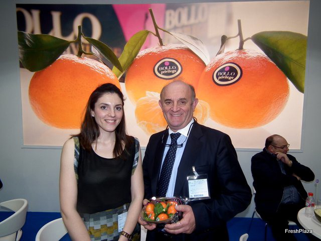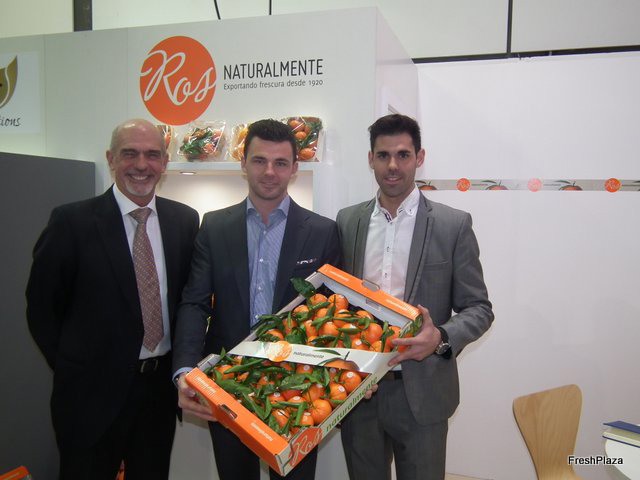 Juan Pedro Beltrán con sus hijos Terry y Lionel, en su stand de V.Ros, empresa castellonense especializada en la producción y comercialización de clementina con hoja.