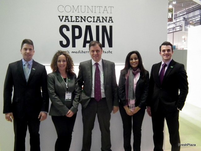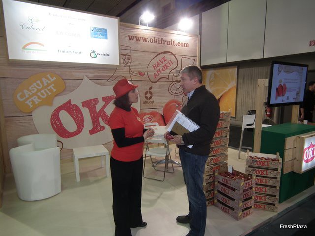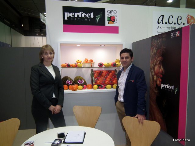 Responsables comerciales en el stand de Quid Pro Quo, en el pabellón de la Comunidad Valenciana, promocionando su marca Perfect Nature para frutas.