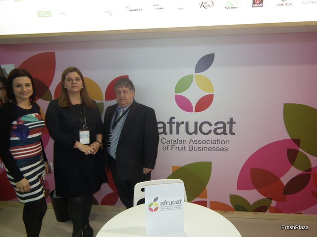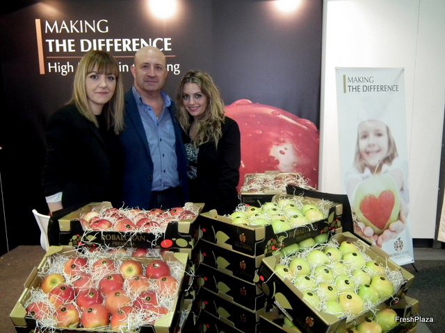 Responsables comerciales en el stand de Copa Trading, especialistas en fruta de pepita de la provincia de Lleida (España). Este año han añadido la variedad de manzana Story Inored, de color rojo oscuro intenso, una fruta dura que aguanta muy bien en cámara.