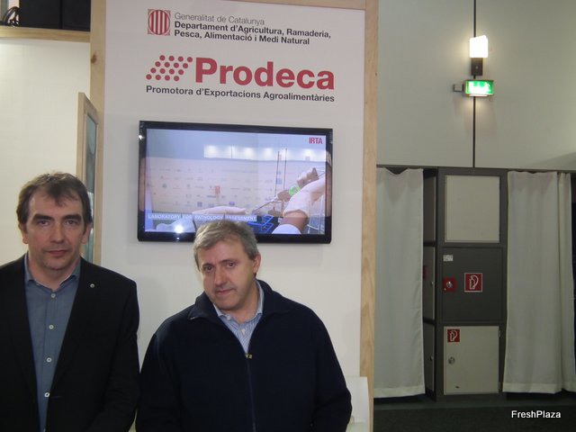 Equpo técnico de el Instituto de Investigación Irta, en el stand de Prodeca, pabellón de Cataluña.