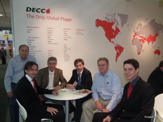 Stand de Decco, productor y distribuidor de soluciones para el tratamiento de poscosecha. En la foto, Philippe Darriacarrère (para Argentina) , Daniel Alabadi (worldwide), Miguel Sanchís (España), Muli Einhoren (Israel), André Muulman.