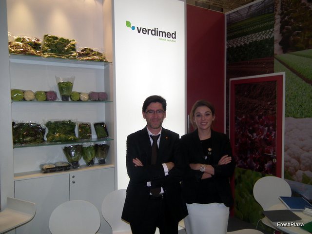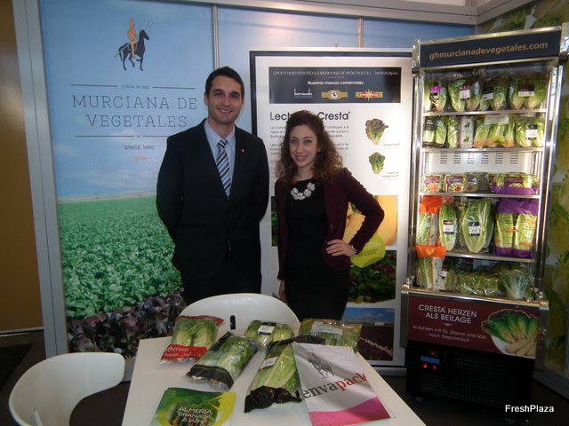 Stand de Murciana de Vegetales con Miguel Sanmartín, del departamento comercial, y su compañera. La empresa de Murcia se especializa en la producción y comercialización de lechuga fresca.