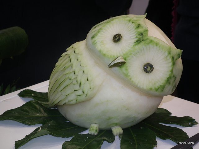 Figura realizada con pulpa de melón piel de sapo en el stand de Procomel.