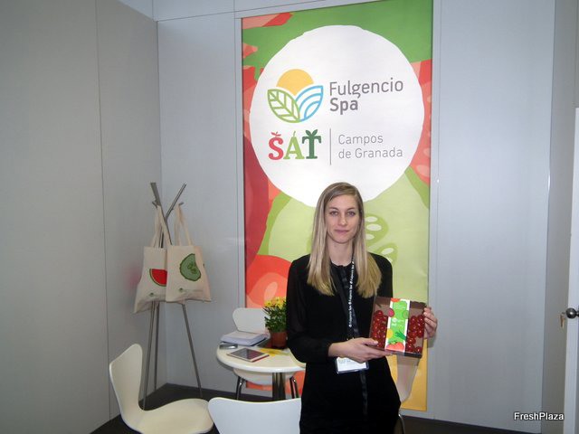 Paula Spá Martín en su stand de Fulgencio Spá, empresa de Granada (España)especialista en tomates cherry y pimientos de padrón. La novedad de este año ha sido la incorporación a su surtido de los tomates cherry Mini Tomachoc, la cual está resultando un éxito.