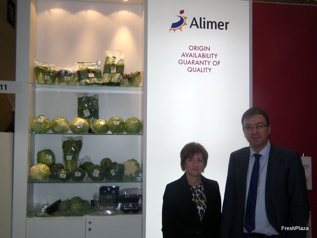 Jesús Abenza y su compañera en su stand de Alimer, la mayor empresa productora de brócoli de Europa.