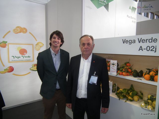 Francisco Espinoza padre e hijo en su stand de Vega Verde, promocionando sus cítricos y frutas tropicales eológicas de la provinia de Málaga (España)