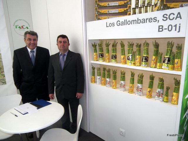 Pedro Sillero y Francisco Delgado en su stand de Los Gallombares, exponiendo sus espárragos importados de México. En Marzo empezarán con su campaña de espárragos de Granada.