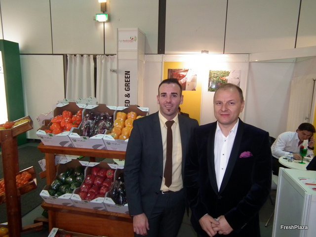 Stand de Agro Red & Green con su gerente Ibán Martos a la izquierda. La empresa de Almería se especializa en pimientos y acaba de incluir a su catálogo una variedad de tomate rosa.