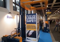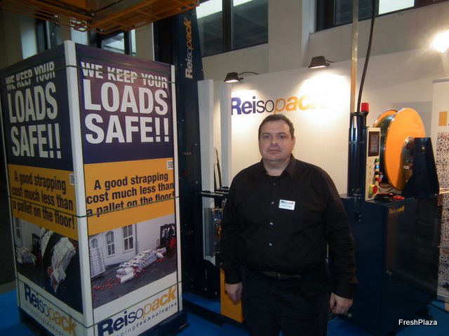 Óscar Saldana, gerente de Reisopack S.L., junto a su máquina flejadora y colocadora de cantoneras para palets Reisopack 2901.