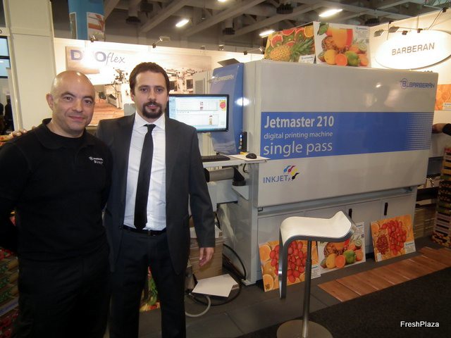 Equipo técnico de la empresa catalana Barberán promocionando su maquinaria de impresión digital para envases.
