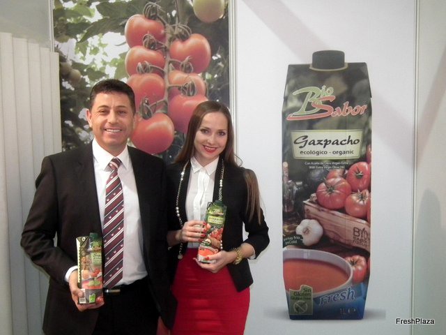 Francisco S. Belmonte, presidente de Biosabor, promocionando el gazpacho eológico y la nueva sopa de tomate ecológica dirigida al mercado alemán.