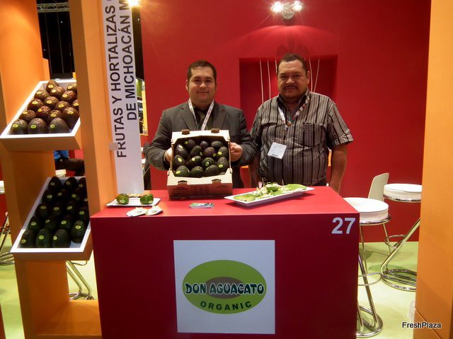 José Luís Tungüi Olivo con su hijo Juan Carlos en su stand de Frutas y Hortalizas de Michoacán México, promocionando sus aguacates michoacanos orgánicos.