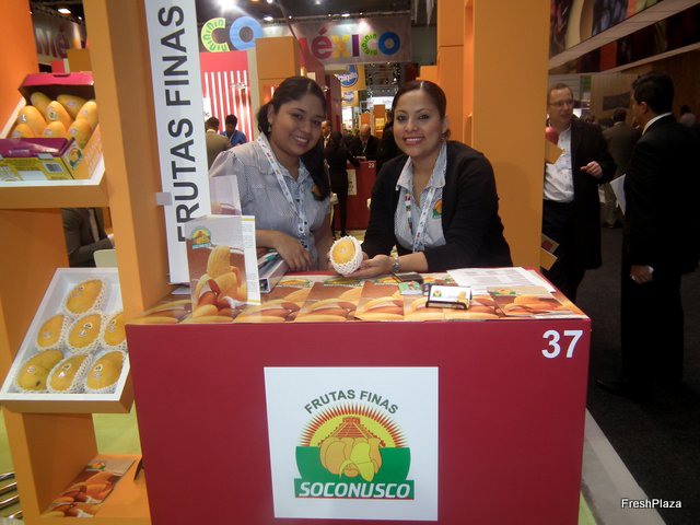 Irani Hernández y Eva Fuentes de la empresa Frutas Finas, promocionando su marca Soconusco para mangos, en el pabellón de México.