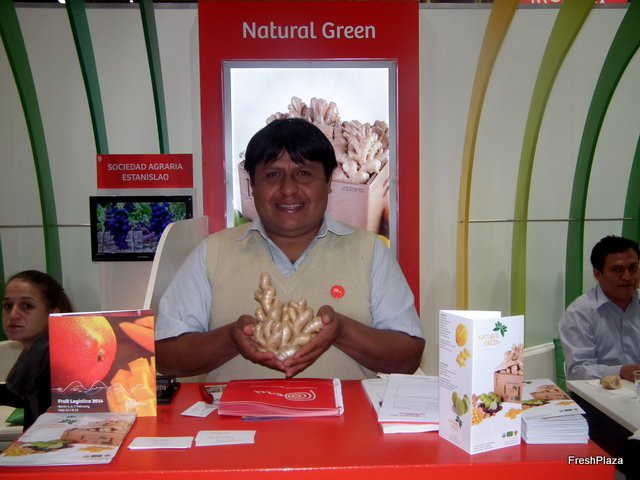 Elvis Méndez, Producer Manager de Natural Green, promocionando su jengibre en el pabellón de Perú.