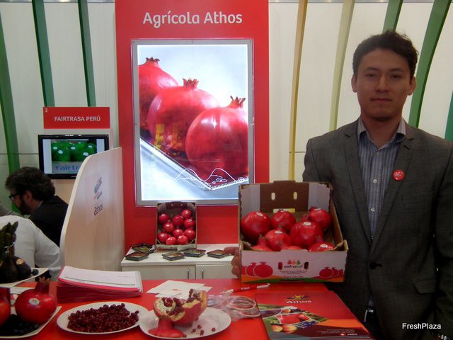 Bergen Alcántara Radja en su stand de Agrícola Athos, promocionando la granada de Perú.