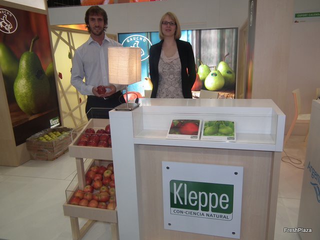 Javier Orti y su compañera en el stand de KLEPPE S.A., empresa argentina de Rio Negro especialista en manzanas y peras.