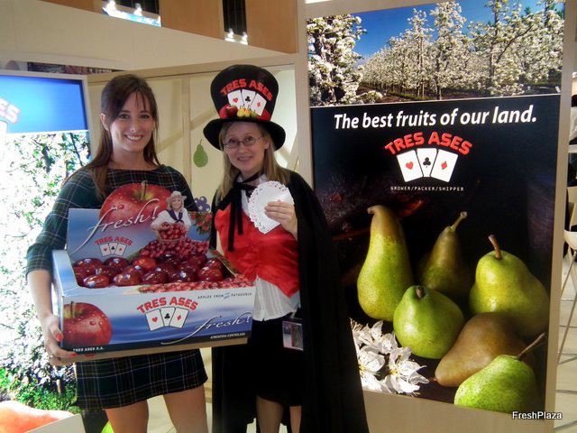 Mariana Grisanti, de la empresa argentina Tres Ases,junto a la mago de las cartas. La empresa de Río Negro (Argentina) produce y comercializa todo tipo de manzanas y peras.