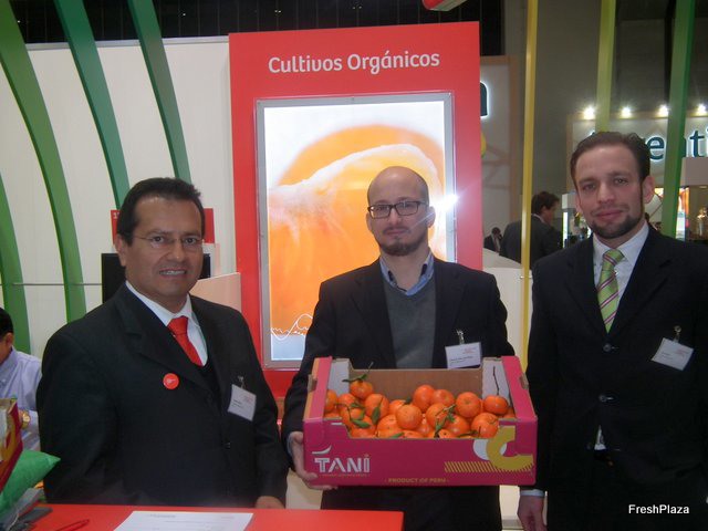 Miembros de la empresa Cultivos Orgánicos promocionando los cítricos orgánicos peruanos con marca TANI.