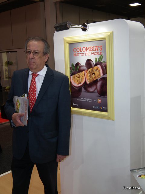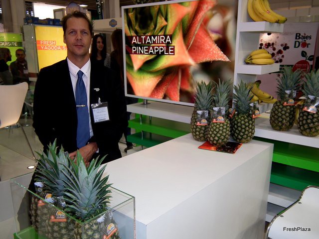 Richard Huizinga, presidente de Hacienda Altamira, en el pabellón de costa Rica, promocionando las piñas y bananas costaricenses.