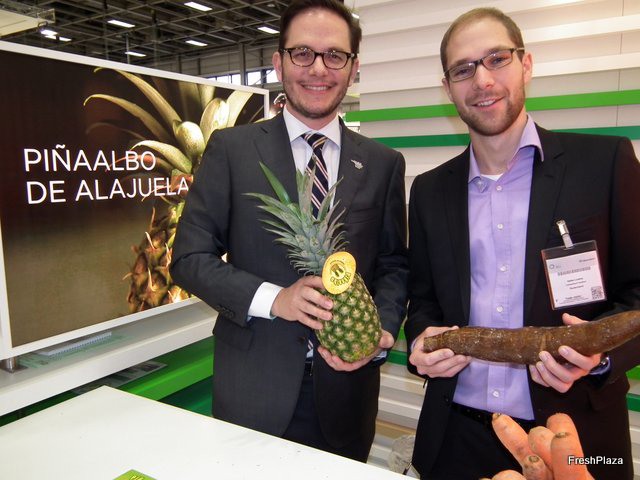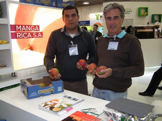 Francis Durman y Andrés Medina en el stand de Manga Rica S.A. promocionando los mangos de Costa Rica.