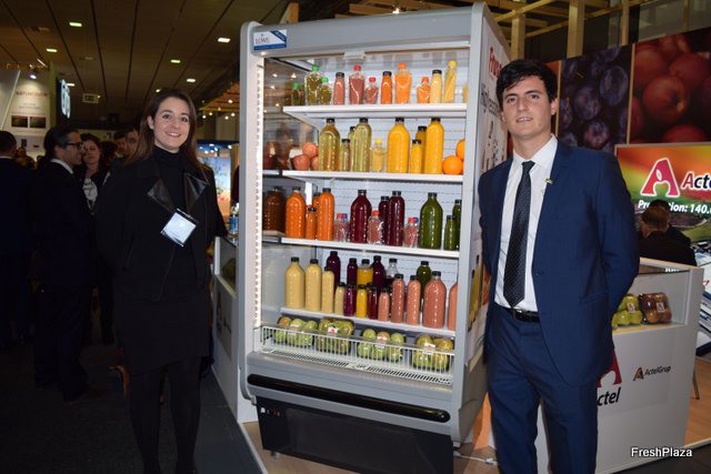 Guillermo Vives y compañera, de FRUSELVA, exponiendo su nueva gama de zumos naturales y smoothies de frutas y verduras.