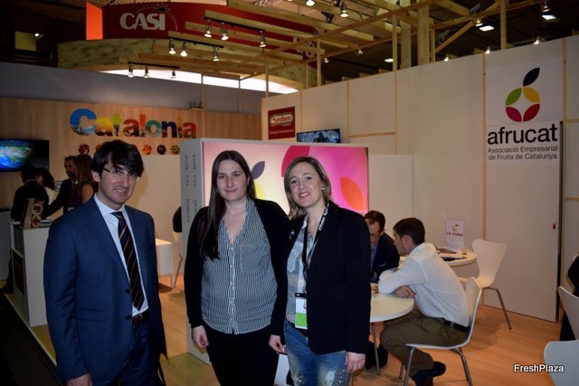Manel Simon, Sara y Merce Gispert, en el stand de Afrucat, en representación de la fruta de Cataluña.