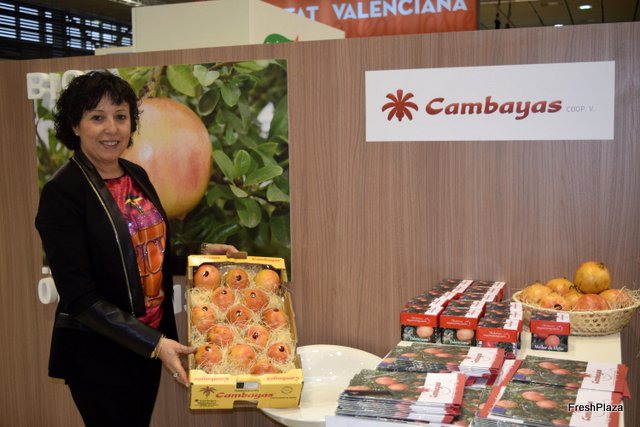 Susi Bonet, del departamento comercial de Cambayas, promocionando la granada Mollar de Elche.