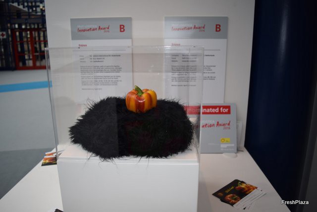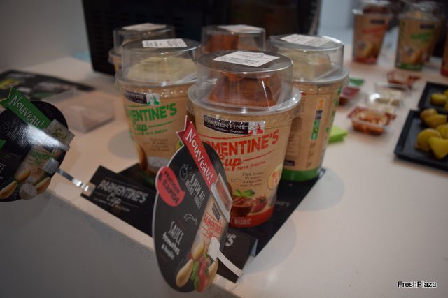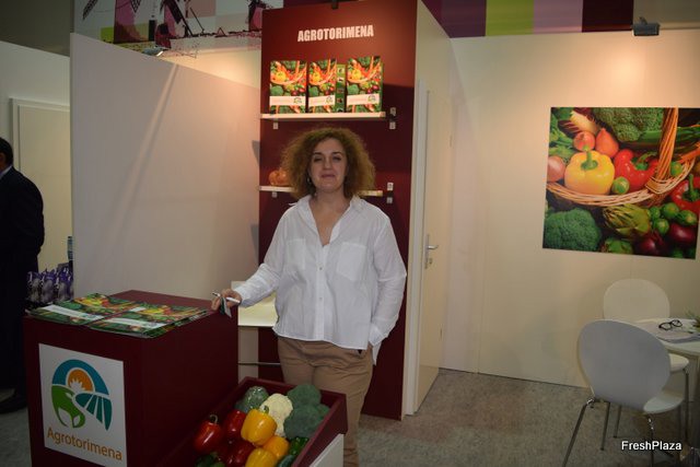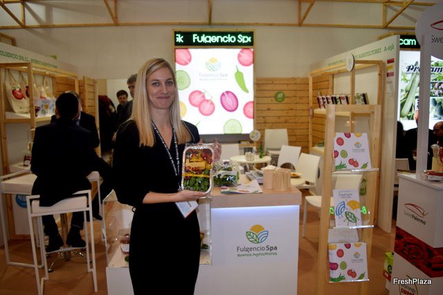 Paula Spa, presentando el nuevo mix de pimientos y tomates cherry para BBQ en el stand de Fulgencio Spa.