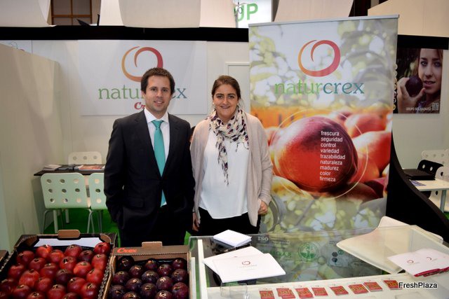 Maximiliano y Alicia en el stand de Nogalfruits, empresa extremeña especialista en fruta de hueso y nueces.