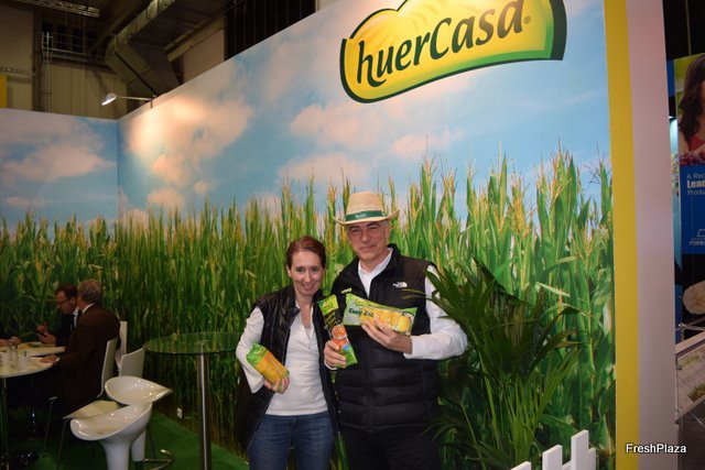 Stand de Huercasa con música country de fondo, referentes en en maíz cocido, en promoción de nuevos productos de V gama como las tiras de zanahoria cocida.