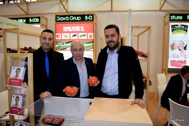 Francesc Lonch y sus compañeros en el stand de Gavà Grup, apostando por el tomate asurcado Monterosa, de Semillas Fitó, por el cual tienen la exclusividad de producción en Granada y Almería.