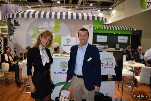 Carolina Quintero, agente comercial de Colombia y Javier Hernández en el stand de Eurobanan.