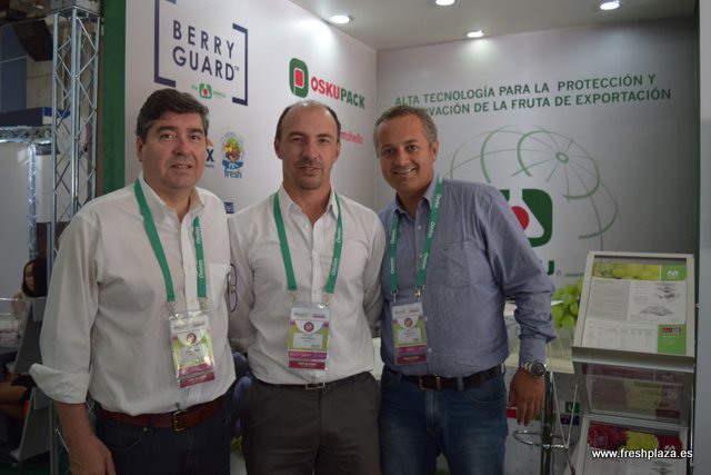 Berry Guard, lanzando su producto nuevo de tecnología de packing para arandanos. De izquierda a derecha: Christian Arancivia, Mauricio Ostornol y Carlos Salgado.