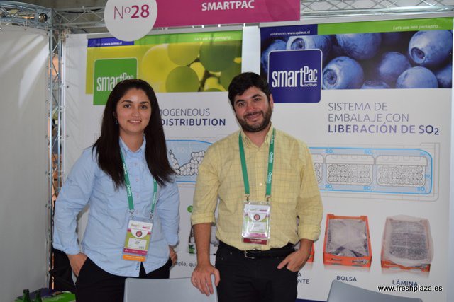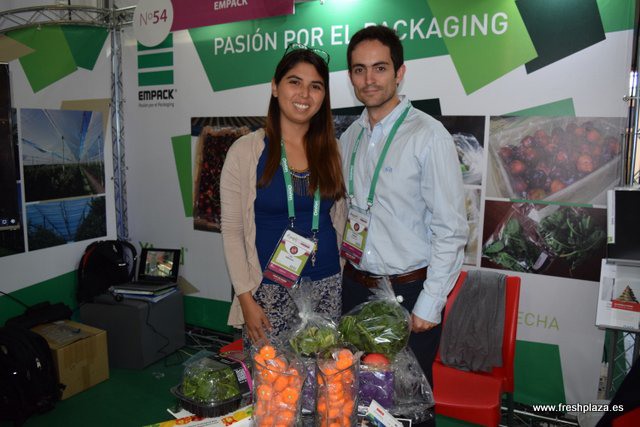 Empack promocionando el empaque por atmósfera modificada que permite tener un tiempo más alto de vida util para la fruta. Daniela Gutiérrez y Felipe Magnan fueron sus representantes.