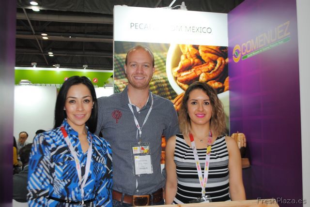 Jorick Voorzee y sus dos colegas en el stand de Comenuez, promocionando las nueces pecanas de México.