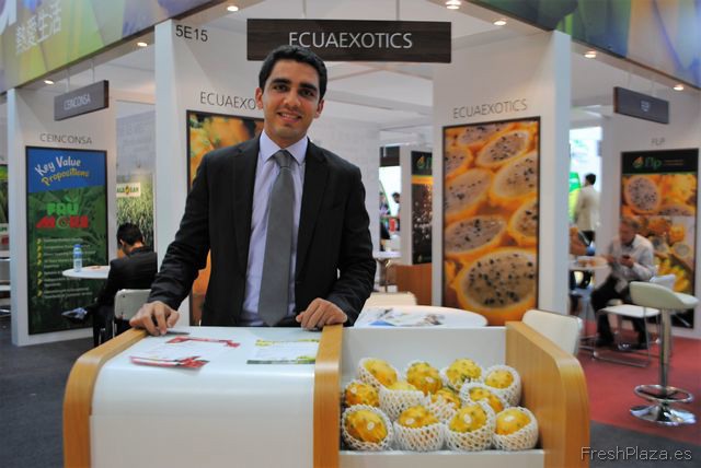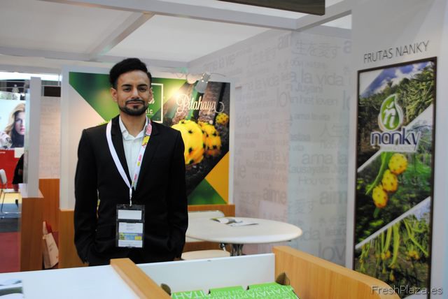 Juan López en representación de Frutas Nanky, Ecuador. Promocionó la pitahaya amarilla, uno de los productos que ofrece.